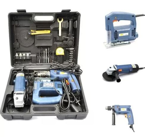Сразу три самых часто используемых инструмента в чемоданчике – дрель, лобзик и болгарка. Полностью укомплектованы. Плюс перчатки, рулетка и канцелярский нож.